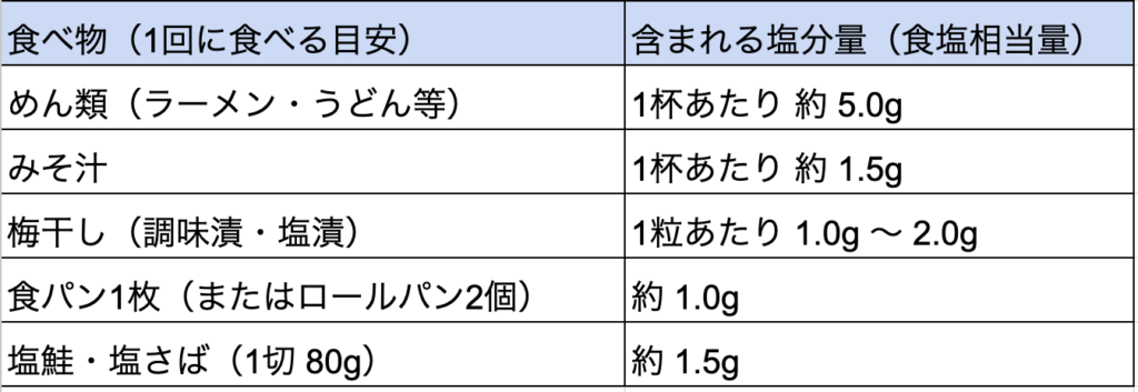 - 優先順位が大事: 大切なのは、もともと塩分が多くて自分が「よく食べるもの」を見直すこと。以下に、普段よく口にする機会が多くかつ含まれる食塩相当量の多い食品一例を挙げてみました。