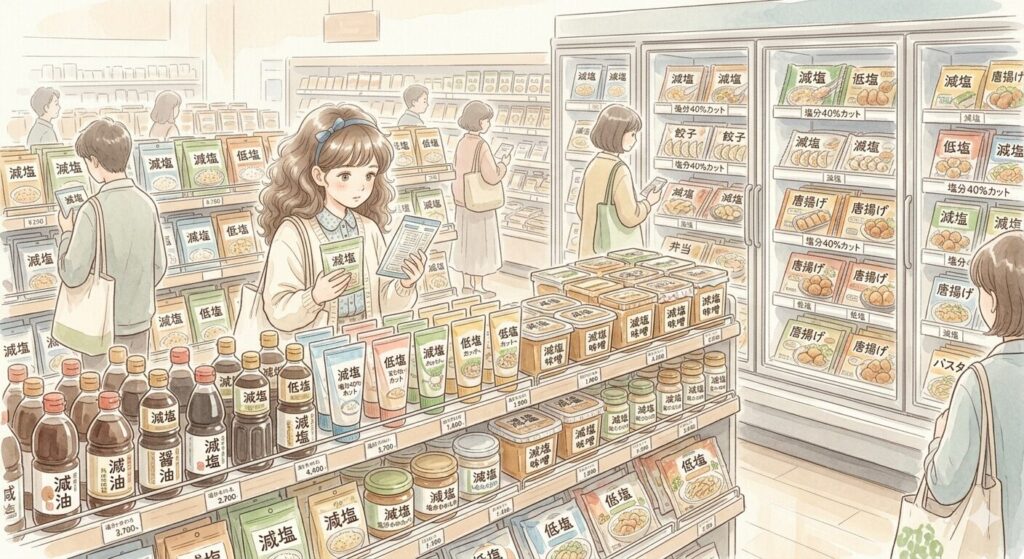 スーパーの棚に並ぶ「塩分ひかえめ」「低塩」「減塩」「塩分◯%カット」の文字。 どれも健康に良さそうに見えますが、**「結局、どれがいいの?」**と迷ったことはありませんか?